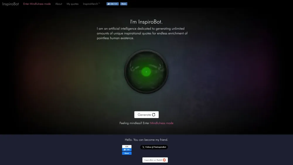 InspiroBot is an AI-driven platform that instantly crafts unique and engaging inspirational quotes with just a click.